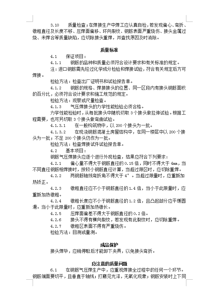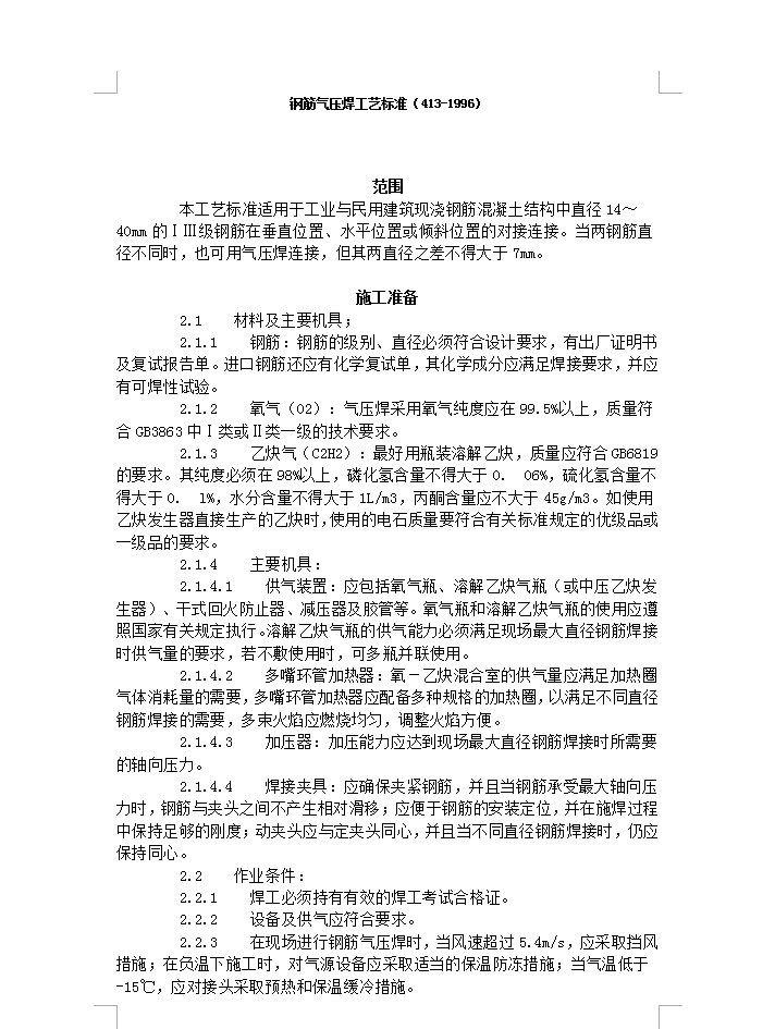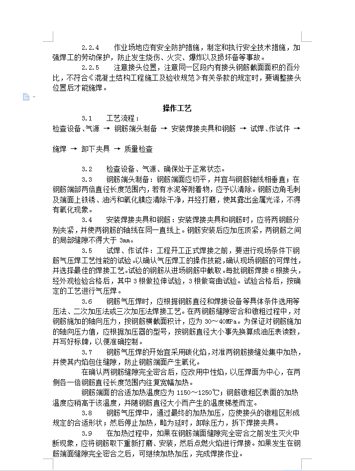 操作工艺 :工艺流程:检查设备、气源 → 钢筋端头制备 → 安装焊接夹具和钢筋 → 试焊、作试件 → 施焊 → 卸下夹具 → 质量检查 ,检查设备、气源、确保处于正常状态。钢筋端头制备:钢筋端面应切平,并宜与钢筋轴线相垂直;在钢筋端部两倍直径长度范围内,若有水泥等附着物,应予以清除。钢筋边角毛刺及端面上铁锈、油污和氧化膜应清除干净,并经打磨,使其露出金属光泽,不得有氧化现象。安装焊接夹具和钢筋:安装焊接夹具和钢筋时,应将两钢筋分别夹紧,并使两钢筋的轴线在同一直线上。钢筋安装后应加压顶紧,两钢筋之间的局部缝隙不得大于3mm。试焊、作试件:工程开工正式焊接之前,要进行现场条件下钢筋气压焊工艺性能的试验。以确认气压焊工的操作技能,确认现场钢筋的可焊性,并选择最佳的焊接工艺。试验的钢筋从进场钢筋中截取。每批钢筋焊接6根接头,经外观检验合格后,其中3根做拉伸试验,3根做弯曲试验。试验合格后,按确定的工艺进行气压焊。钢筋气压焊时,应根据钢筋直径和焊接设备等具体条件选用等压法、二次加压法或三次加压法焊接工艺。在两钢筋缝隙密合和镦粗过程中,对钢筋施加的轴向压力,按钢筋横截面积计,应为30~40MPa。为保证对钢筋施加的轴向压力值,应根据加压器的型号,按钢筋直径大小事先换算成油压表读数,并写好标牌,以便准确控制。