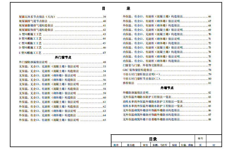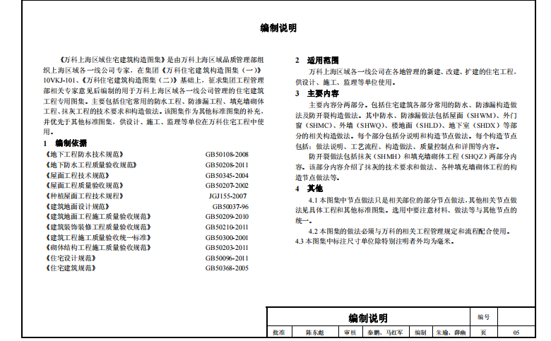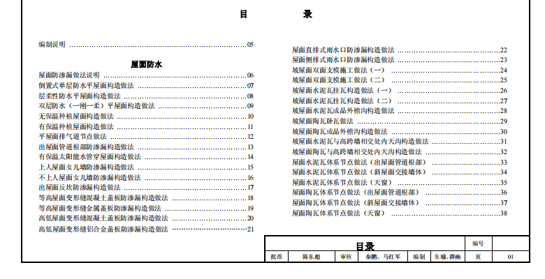 主要内容分两部分。包括住宅建筑各部分常用的防水。防渗漏构造做法及防开裂构造做法。其中防水、防渗漏做法包括屋面(SHWM).外门