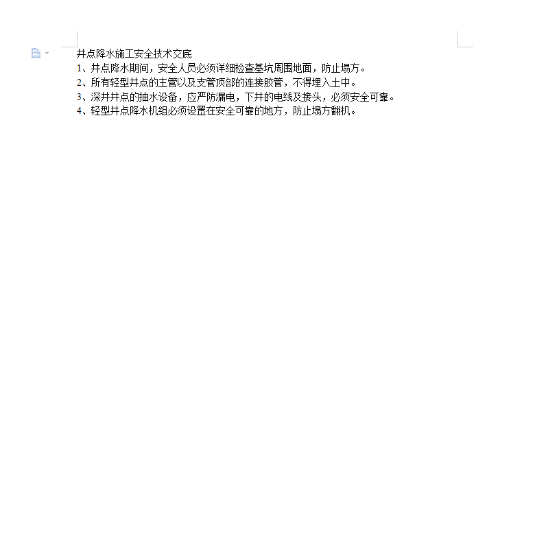 井点降水期间,安全人员必须详细检查基坑周围地面,防止塌方。 所有轻型井点的主管以及支管顶部的连接胶管,不得埋入土中。 深井井点的抽水设备,应严防漏电,下井的电线及接头,必须安全可靠。 轻型井点降水机组必须设置在安全可靠的地方,防止塌方翻机。