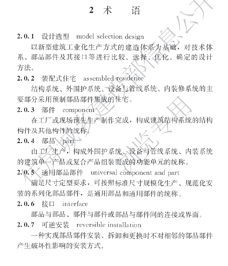 1.0.3装配式 住宅应选用标准化程度高、接口通用性强、性能优良、安装高效、维护更换便捷的部品部件,满足住宅安全耐久、绿色环保、健康舒适和经济适用等性能要求。