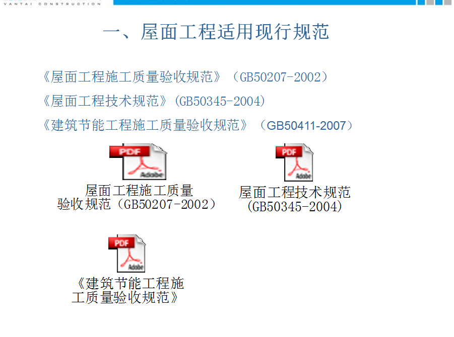 主要内容:屋面工程适用现行规范、施工工艺流程、平屋面、露台细部构造做法、结构基层处理、聚氨酯涂膜防水、SBS改性沥青防水层施工