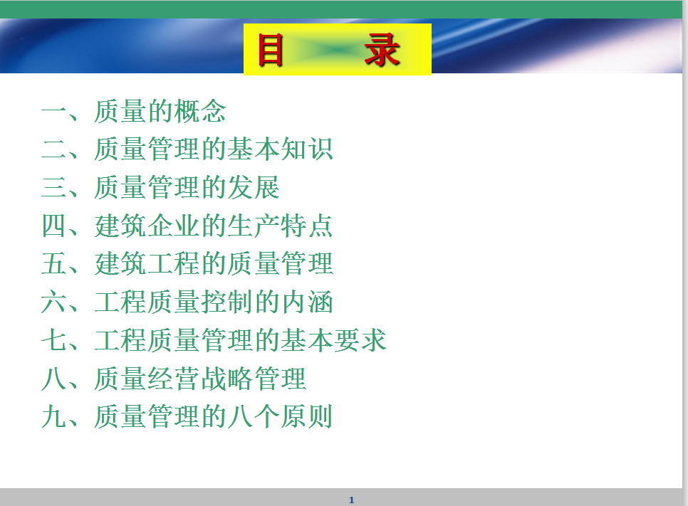 主要内容:质量的概念、质量管理的基本知识、质量管理的发展、建筑企业的生产特点、建筑工程的质量管理、工程质量控制的内涵、工程质量管理的基本要求、质量经营战略管理、质量管理的八个原则。