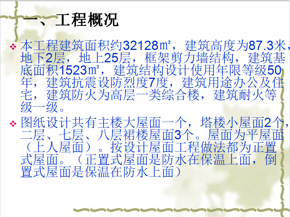 本工程建筑面积约32128㎡,建筑高度为87.3米,地下2层,地上25层,框架剪力墙结构,建筑基底面积1523㎡,建筑结构设计使用年限等级50年,建筑抗震设防烈度7度,建筑用途办公及住宅,建筑防火为高层一类综合楼,建筑耐火等级一级。