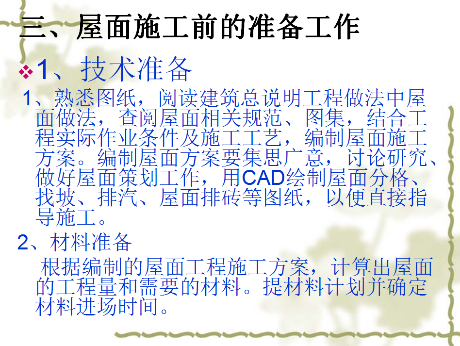 主要内容:工程概况、编制依据、屋面施工前的准备工作、屋面施工各工序的工艺。
