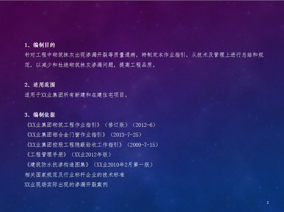 编制目的针对工程中砌筑抹灰出现渗漏开裂等质量通病,特制定本作业指引,从技术及管理上进行总结和规范,以减少和杜绝砌筑抹灰渗漏问题,提高工程品质。