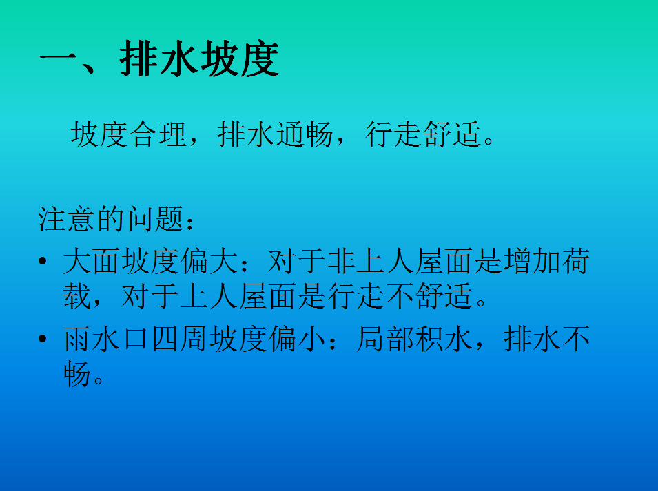 主要内容:排水坡度、防水收头、雨水口、出屋面管道、排气孔、分格缝、滴水、雨水管、烟风道。