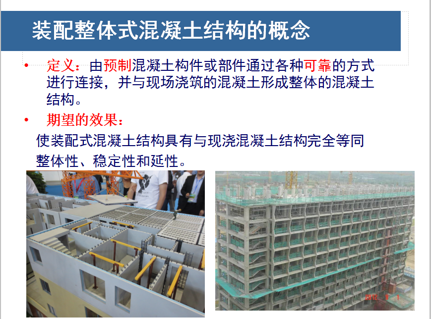 装配整体式混凝土结构由预制混凝土构件或部件通过各种可靠的方式进行连接,并与现场浇筑的混凝土形成整体的混凝土结构。