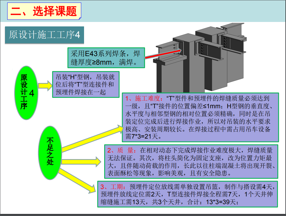 “H”型钢梁和柱内预埋件通过“T”型件连接, “T”型件与预埋件采用焊接形式连接,与H型钢梁采用螺栓连接。“T”型件和“H”型钢上分别开长圆孔,从而实现结构柱与钢梁之间的相对位移,满足建筑物的变形要求。