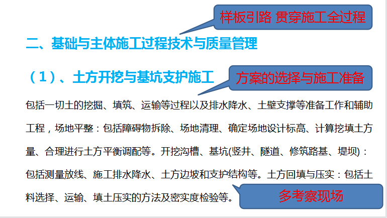 土方开挖与基坑支护施工:包括一切土的挖掘、填筑、运输等过程以及排水降水、土壁支撑等准备工作和辅助工程,场地平整:包括障碍物拆除、场地清理、确定场地设计标高、计算挖填土方量、合理进行土方平衡调配等。开挖沟槽、基坑(竖井、隧道、修筑路基、堤坝):包括测量放线、施工排水降水、土方边坡和支护结构等。土方回填与压实:包括土料选择、运输、填土压实的方法及密实度检验等。