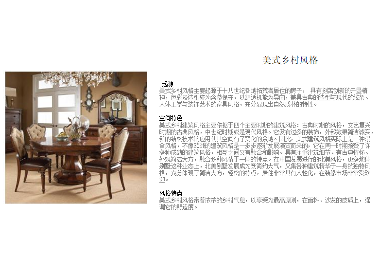 美式乡村建筑风格主要依据于四个主要时期的建筑风格:古典时期的风格,文艺复兴时期的古典风格,中世纪时期或是现代风格。它没有过多的装饰,外部效果简洁诚实,新的结构技术的应用使其空间有了变化的余地。因此,美式建筑风格实际上是一种混合风格,不像欧洲的建筑风格是一步步逐渐发展演变而来的,它在同一时期接受了许多种成熟的建筑风格,相互之间又有融合和影响。具有注重建筑细节、有古典情怀、外观简洁大方,融合多种风情于一体的特点。在中国发展进行的北美风格,更多地体别墅这种业态上,北美别墅发展成为既简约大气,又集各种建筑精华于一身的独特风格,充分体现了简洁大方,轻松的特点,居住非常具有人性化,在装修市场非常受欢迎