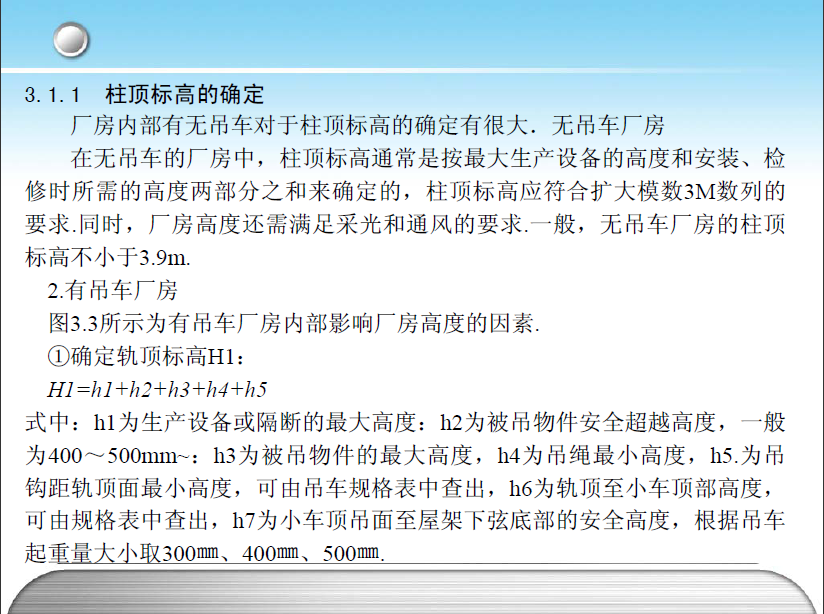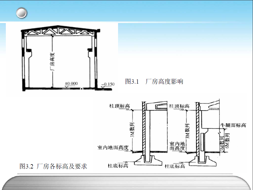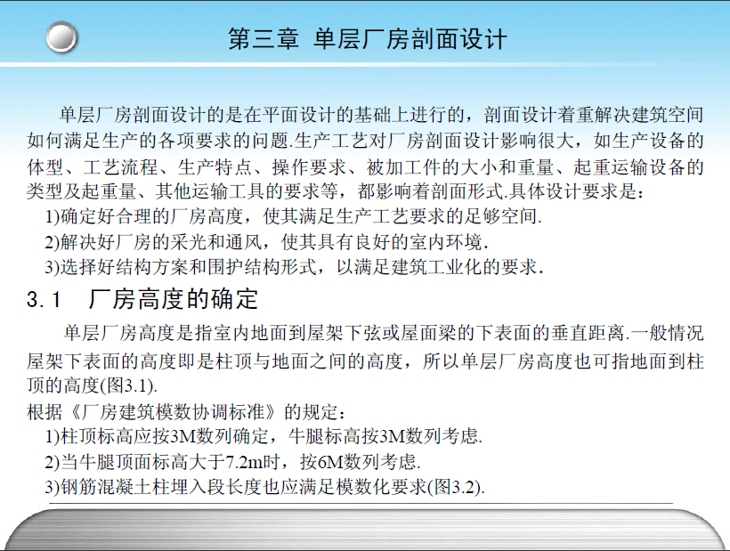 单层厂房剖面设计的是在平面设计的基础上进行的,剖面设计着重解决建筑空间如何满足生产的各项要求的问题.生产工艺对厂房剖面设计影响很大,如生产设备的体型、工艺流程、生产特点、操作要求、被加工件的大小和重量、起重运输设备的类型及起重量、其他运输工具的要求等,都影响着剖面形式.