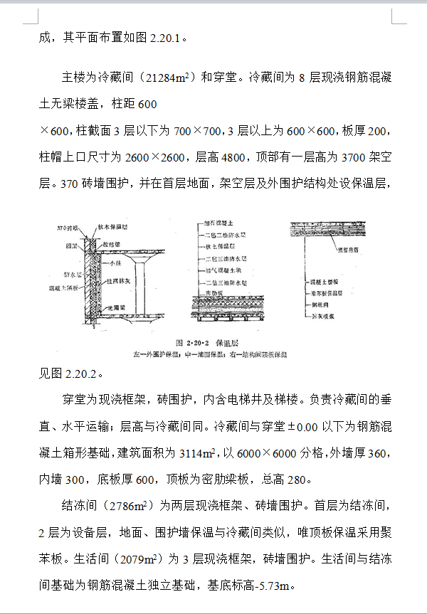 建筑面积:35952m2,结构形式:本工程由冷藏间、穿堂、结冻间和生活间等组成,主楼为冷藏间(21284m2)和穿堂。冷藏间为8层现浇钢筋混凝土无梁楼盖,柱距600×600,柱截面3层以下为700×700,3层以上为600×600,板厚200,柱帽上口尺寸为2600×2600,层高4800,顶部有一层高为3700架空层。370砖墙围护,并在首层地面,架空层及外围护结构处设保温层,穿堂为现浇框架,砖围护,内含电梯井及梯楼。负责冷藏间的垂直、水平运输;层高与冷藏间同。冷藏间与穿堂±0.00以下为钢筋混凝土箱形基础,建筑面积为3114m2,以6000×6000分格,外墙厚360,内墙300,底板厚600,顶板为密肋梁板,总高280。 结冻间(2786m2)为两层现浇框架、砖墙围护。首层为结冻间,2层为设备层,地面、围护墙保温与冷藏间类似,唯顶板保温采用聚苯板。生活间(2079m2)为3层现浇框架,砖墙围护。生活间与结冻间基础为钢筋混凝土独立基础,基底标高-5.73m。本建筑装修为一般装修,唯外墙涂刷一层白色涂料。
