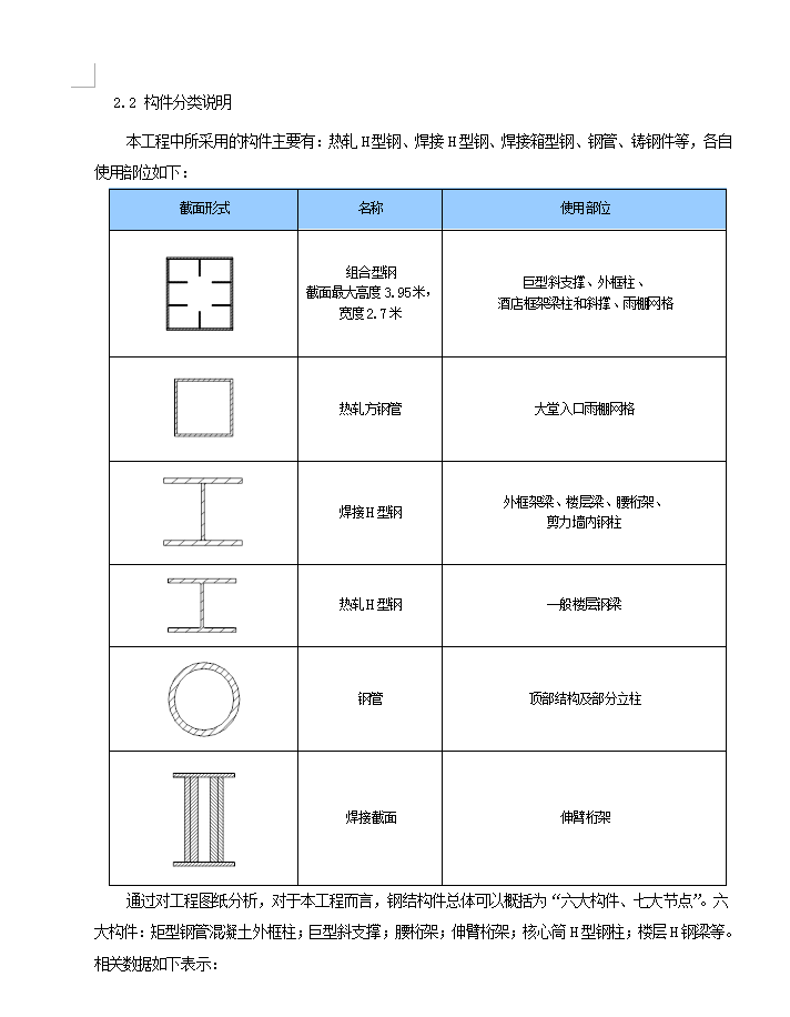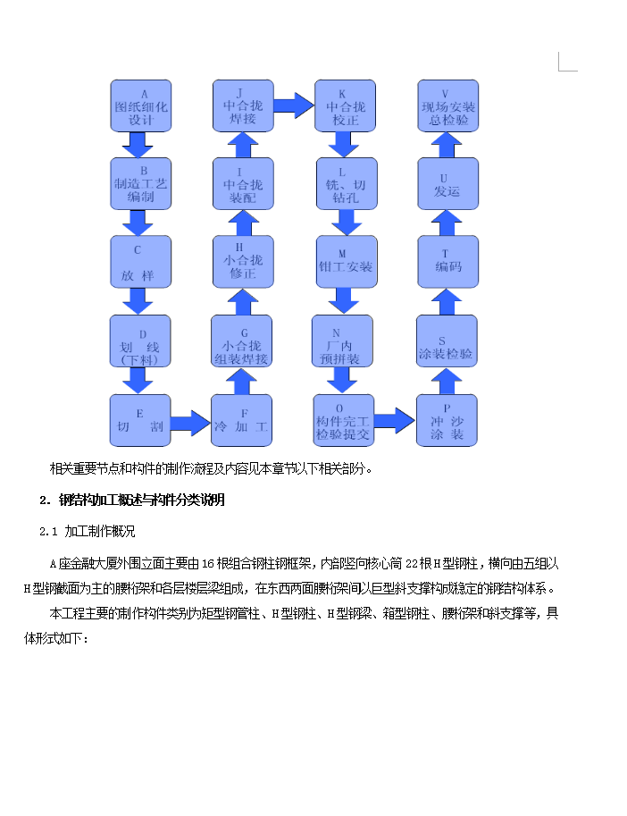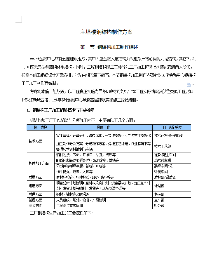 xx.**金融中心共有五座建筑组成,其中A座金融大厦结构为钢框架-核心筒剪力墙结构,其它B、C、D、E座无典型钢结构体系结构,同时,工程钢结构施工主要分为工厂加工和现场拼装或安装两大阶段,按照本施工组织设计方案安排,分别由相应章节编写,本节钢结构加工制作内容针对A座金融中心钢结构工厂加工制作而编制。