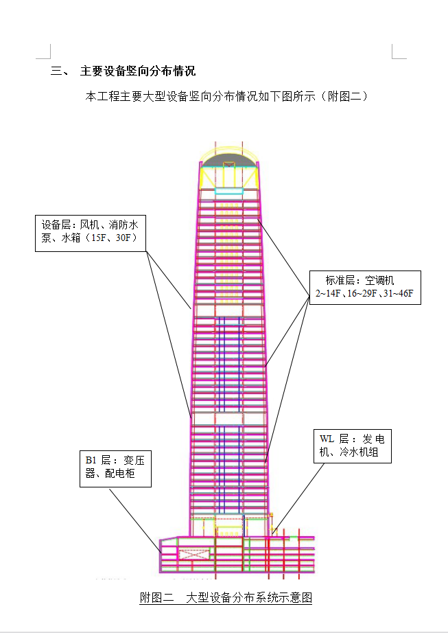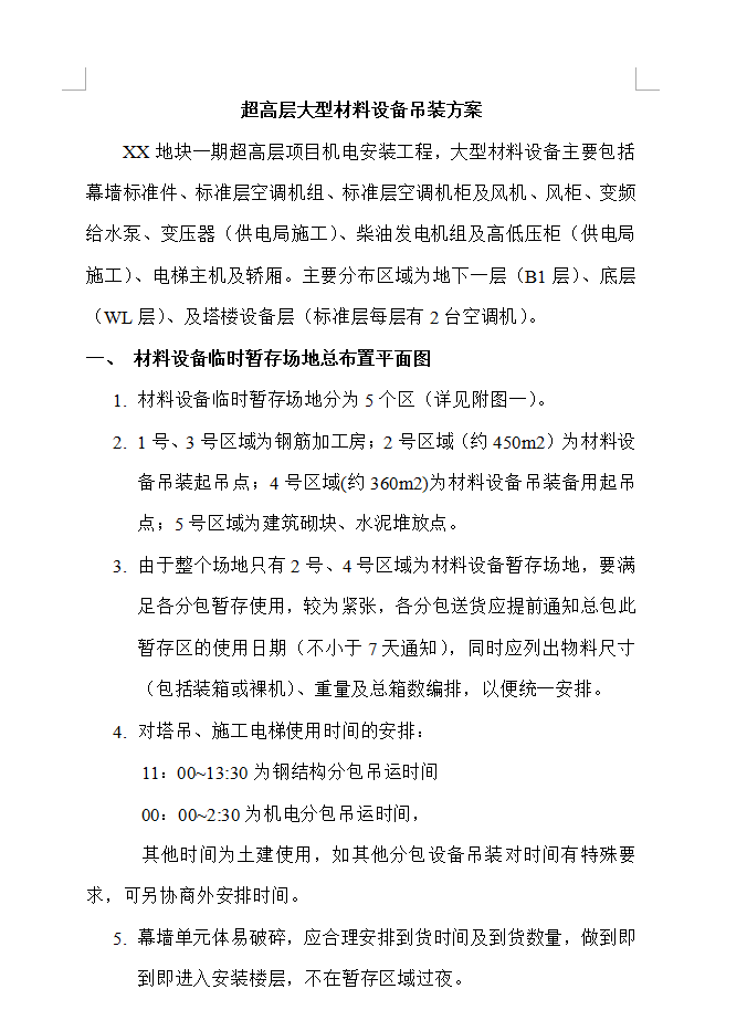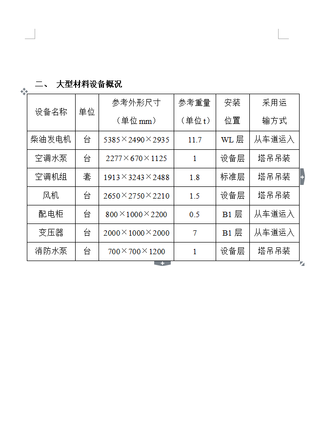 吊装难点、重点分析:1.设备分布楼层多,每层都有设备,而设备层15层、30层更加集中,垂直运输量大。2.设备超高层吊装时,吊装过程中的安全措施难度大,通信联络难度大,要求高。3.垂直运输机械使用频繁,协调难度大。4.专业交叉施工多,协调难度大。尤其幕墙的吊运安装会影响其他设备的安装。本工程塔楼两部施工电梯的额定负荷为1000千克,施工电梯内净空最大为2300×1500×3000,小型设备均可使用施工电梯进行运输;塔吊远端起吊最大值为3.5t,最近端起吊最大值为8.5t,针对避难层设备比较集中的特点,在15层、30层及需要设卸料平台的楼层设置卸料平台,利用塔吊进行吊装运输。