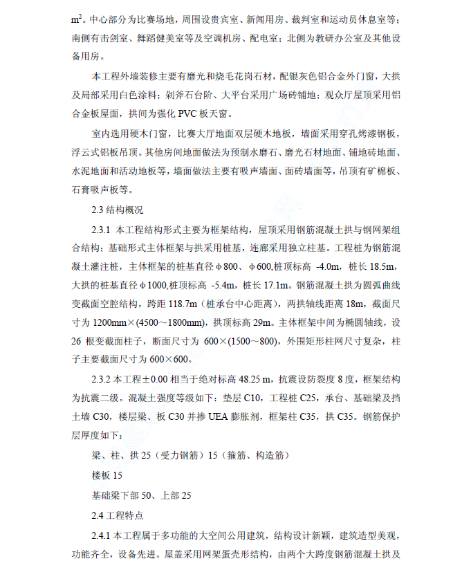 本工程是一座集体育比赛、办公、会议、教学练习、电视转播等于一体的综合性多功能建筑。本工程地上三层(二层以上建筑平面为椭圆形),檐高15m,屋顶拱高29m。首层建筑面积8584 m2 ,总建筑面积12547.85m2。中心部分为比赛场地,周围设贵宾室、新闻用房、裁判室和运动员休息室等;南侧有击剑室、舞蹈健美室等及空调机房、配电室;北侧为教研办公室及其他设备用房。本工程外墙装修主要有磨光和烧毛花岗石材,配银灰色铝合金外门窗,大拱及局部采用白色涂料;剁斧石台阶、大平台采用广场砖铺地;观众厅屋顶采用铝合金板屋面,拱间为强化PVC 板天窗。室内选用硬木门窗,比赛大厅地面双层硬木地板,墙面采用穿孔烤漆钢板,浮云式铝板吊顶。其他房间地面做法为预制水磨石、磨光石材地面、铺地砖地面、水泥地面和活动地板等,墙面做法主要有吸声墙面、面砖墙面等,吊顶有矿棉板、石膏吸声板等。
