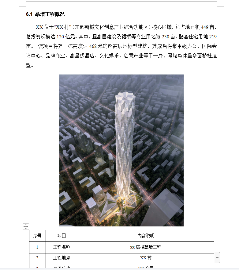 XX位于“XX村”核心区域,总占地面积449亩,总投资规模达120亿元。其中,超高层建筑及裙楼等商业用地为230亩,配套住宅用地219亩。 该项目将建一栋高度达468米的超高层地标型建筑,建成后将集甲级办公、国际会议中心、品牌商业、高星级酒店、文化娱乐、创意产业等于一身。幕墙整体呈多面棱柱造型。XX,建筑方案为多面棱柱、钻石切面方案。在立面上划分为12个模块区域,相邻两个模块之间的凸点与凹点距离为2.530m。同时每个模块逐层渐收,顶部模块尺寸相比底部模块尺寸收缩12.6m。