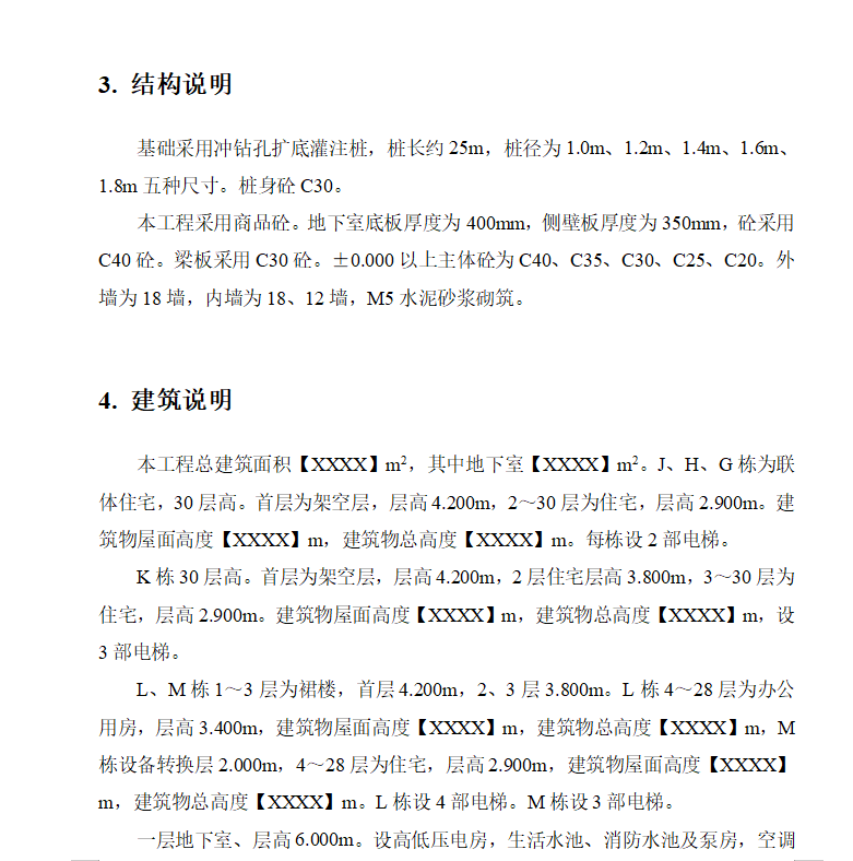 J、H、G栋为联体住宅,30层高。首层为架空层,层高4.200m,2~30层为住宅,层高2.900m。K栋30层高。首层为架空层,层高4.200m,2层住宅层高3.800m,3~30层为住宅,层高2.900m。