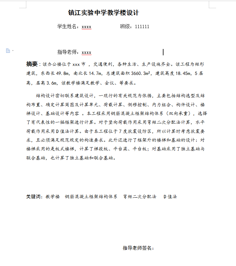 框架结构设计的计算工作量很大,在计算过程中以手算为主,辅以一些计算软件的校正。由于自己水平有限,难免有不妥和疏忽之处,敬请各位老师批评指正。
