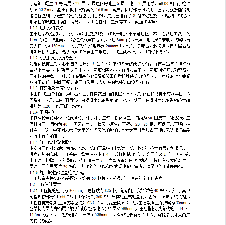 ¸Ã½¨ÖþÎïÊÇÓÉ3 ¶°¸ß²ã£¨23 ²ã£©¡¢Öܱßȹ·¿µØÉÏ6 ²ã£¬µØÏÂ3 ²ã×é³É¡£¡À0.00 Ï൱ÓÚ¾ø¶Ô±ê¸ß50.25m£¬ »ù´¡µ×°åÏÂÆ¤±ê¸ßÔ¼-16.05m¡£¸ß²ã¼°È¹·¿²¿·Ö¾ù²ÉÓúóѹ½¬Äཬ»¤±Ú×ê¿×¹à×¢×®»ù´¡¡£ÎªÑ¡ÔñºÏÀíµÄ×®»ùÉè¼Æ²ÎÊý£¬ÏÈÆÚÒѽøÐÐÁË8 ×éÊÔÑé׮ʩ¹¤ºÍ¼ì²â¡£