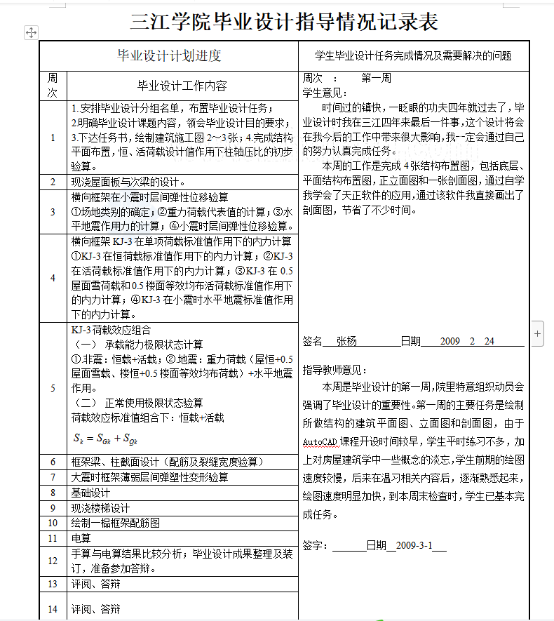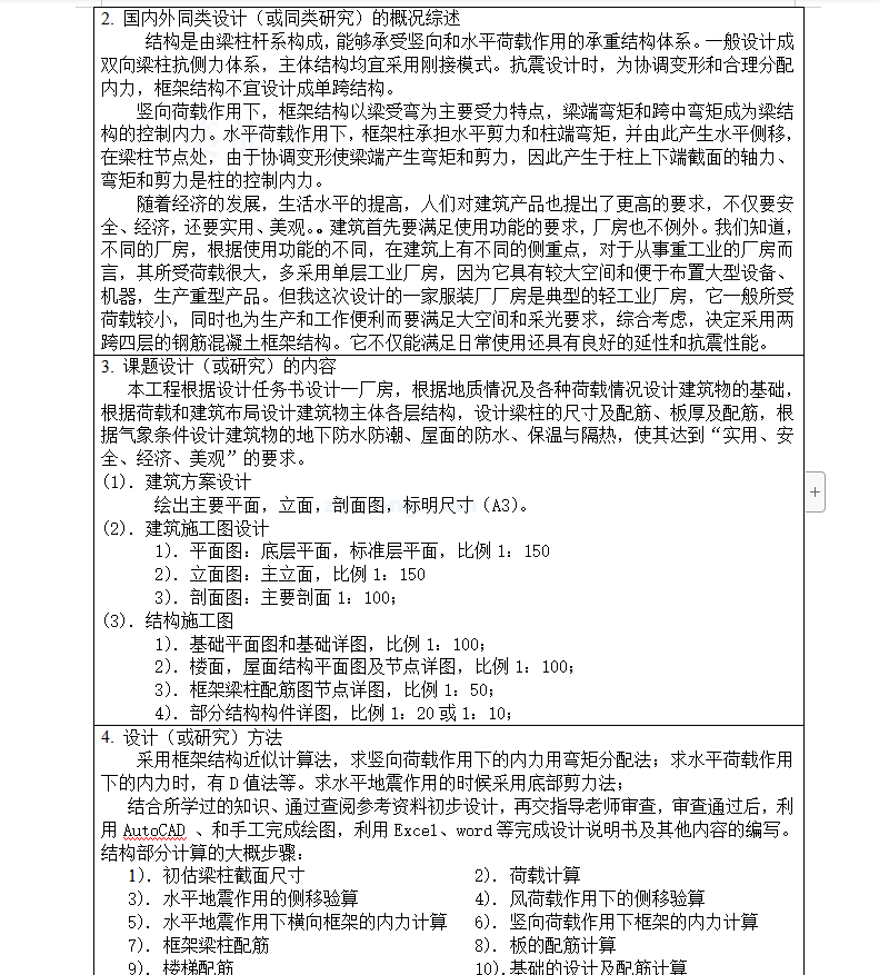 本设计主要包括建筑设计和结构设计两部分。建筑设计,包括平面定位图设计、平面设计、立面设计、剖面设计。结构设计,框架结构设计主要包括:结构选型,梁、柱、墙等构件尺寸的确定,重力荷载计算、横向水平作用下框架结构的内力和侧移计算、水平地震作用下横向框架内力分析、竖向荷载作用下横向框架的内力分析、内力组合、截面设计、基础设计和楼梯设计。其中,基础设计又包括场地判别、基础选型、基础平面布置、地基计算等。