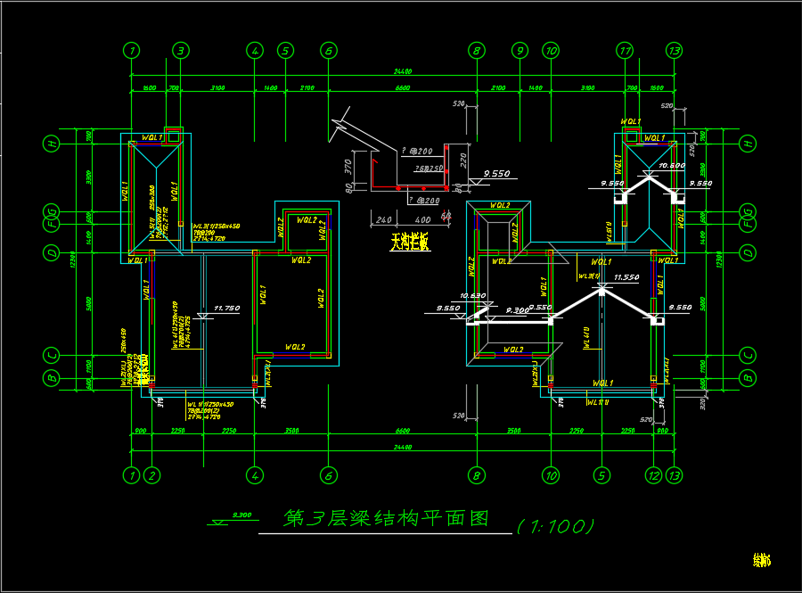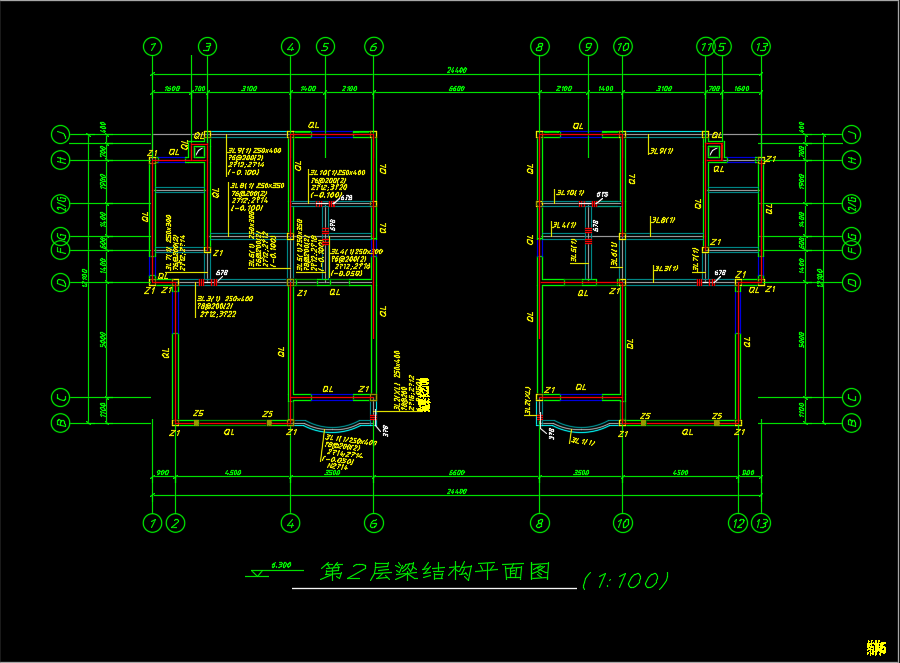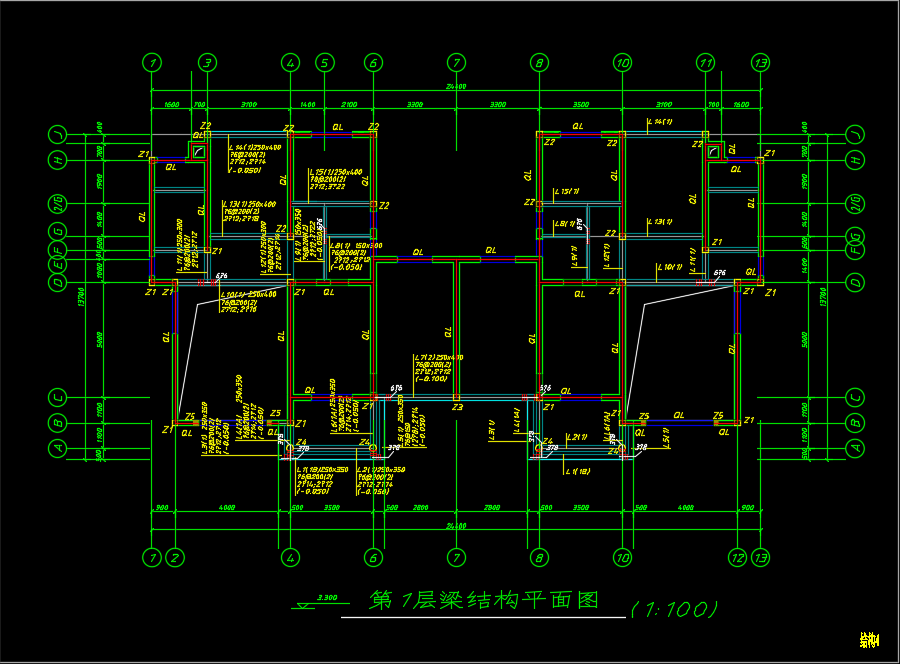 三层混合结构农村自建房别墅设计图纸包括:基础梁平面配筋图、地梁结构平面图、第1层梁结构平面图、第2层梁结构平面图、第3层梁结构平面图、结构大样图。