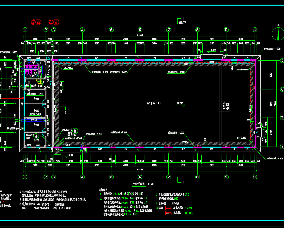 某工业园钢结构厂房建筑施工图纸包括总平面位置图、建筑用料及工程做法、一层平面图、二层及高窗平面图、屋面平面图、立面图、剖面图卫生间、楼梯详图、墙身详图