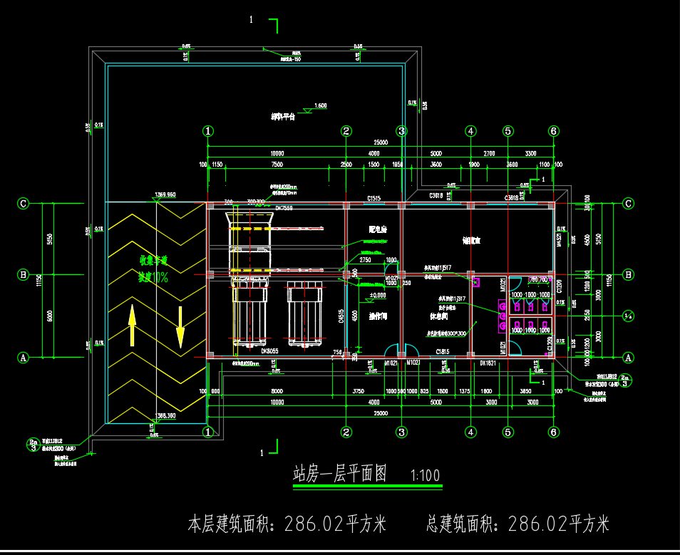 一层垃圾小站建筑施工图纸包括:一层平面图、屋顶层平面图、①-⑥轴立面图、⑥-①轴立面图、A-C轴立面图、C-A轴立面图、1-1剖面图、车道出入口大样图卫生间大样图、门窗表、檐口大样图等等