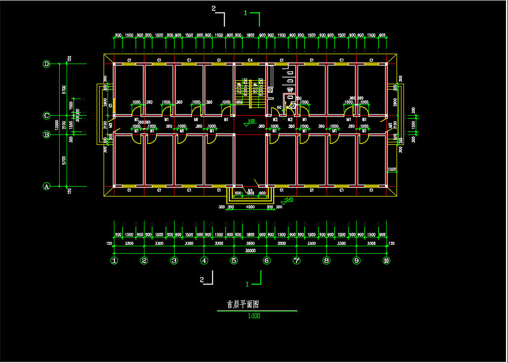 四层职工宿舍楼设计图包括:首层平面图、楼层平面图、南立面图、北立面图、楼层平面图、东立面图、西立面图、剖面图。