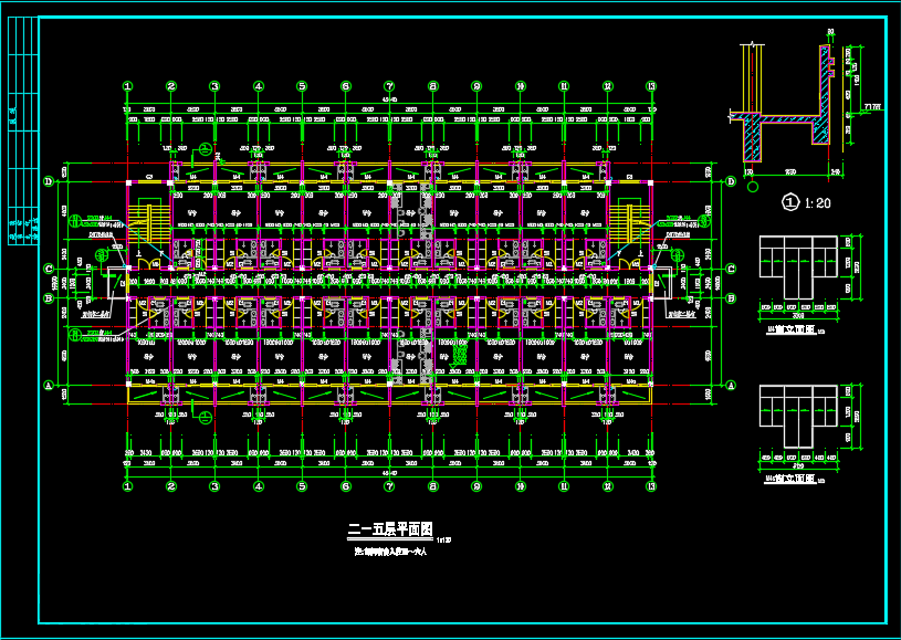 五层中学宿舍楼建筑施工图包括;二-五层平面图、屋顶平面图、一层平面图、卫生间详图、阳台详图、屋顶构架平面图、楼梯屋顶构架立面详图、立面图、剖面图。