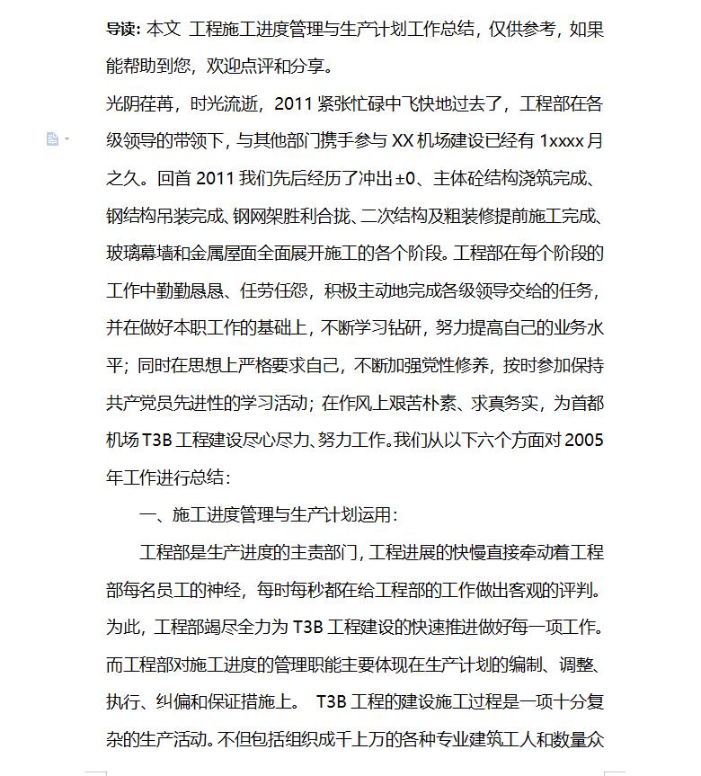 光阴荏苒,时光流逝,2011紧张忙碌中飞快地过去了,工程部在各级领导的带领下,与其他部门携手参与XX机场建设已经有1xxxx月之久。回首2011我们先后经历了冲出±0、主体砼结构浇筑完成、钢结构吊装完成、钢网架胜利合拢、二次结构及粗装修提前施工完成、玻璃幕墙和金属屋面全面展开施工的各个阶段。工程部在每个阶段的工作中勤勤恳恳、任劳任怨,积极主动地完成各级领导交给的任务,并在做好本职工作的基础上,不断学习钻研,努力提高自己的业务水平;同时在思想上严格要求自己,不断加强党性修养,按时参加保持共产党员先进性的学习活动