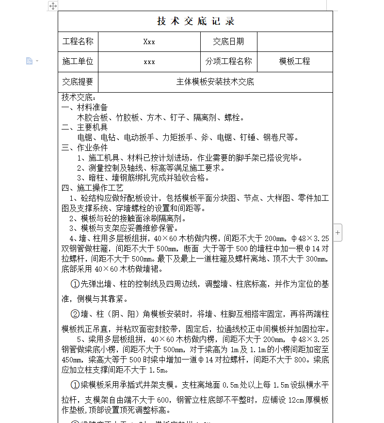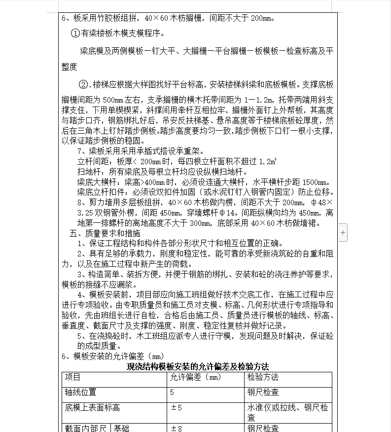 4、墙、柱用多层板组拼,40×60木枋做内楞,间距不大于200mm,ф48×3.25双钢管做柱箍,间距不大于500mm,断面 大于等于500的墙柱中加一根ф14对拉螺杆,间距不大于500mm。最下及最上一道柱箍及螺杆离地、顶不大于300mm,底部采用40×60木枋做墙裙。