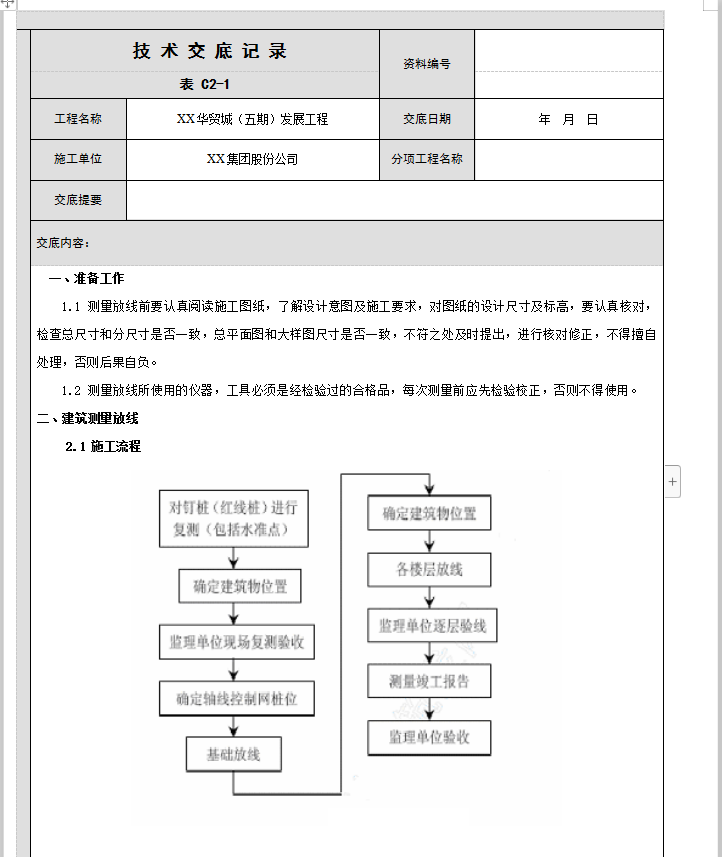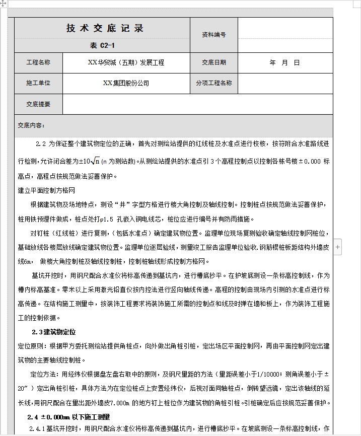 要求进行基础开挖。开挖时,应注意对控制桩的保护。在基础开挖接近设计深度时,在各大角控制桩点上安置仪器,后视对面同轴桩点,将这些点精确超测至槽底土面上,并精确测定各主轴线,检查各主轴线间距,根据所测的轴线特别注意校核图纸尺寸不能算错与轴线的关系。当垫层混凝土施工完后,用上述相同的方法,投测主轴线,同时严格检查主轴线之间的尺寸根据投测的主轴线在垫层上放出保护墙的控制线。