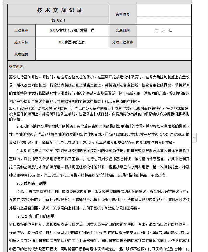 底板放线:防水及其保护层施工完毕后在各大角控制桩点上安置仪器,后视对面同轴桩点,将这些线精确投测至保护层面上,并精确测定各主轴线,检查各主轴线间距,合格后再放出其他的细部轴线作为底板钢筋绑扎的依据。