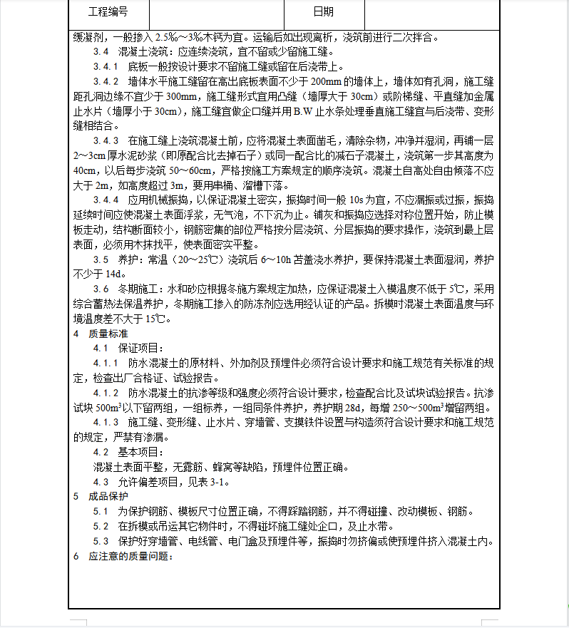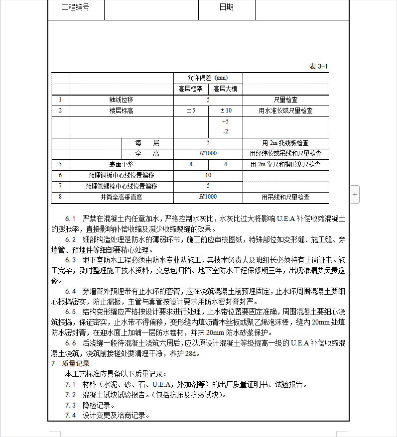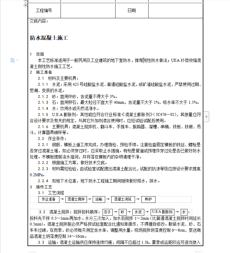 本工艺标准适用于一般民用及工业建筑的地下室防水,推荐刚性防水做法;UEA补偿收缩混凝土刚性防水施工工艺。