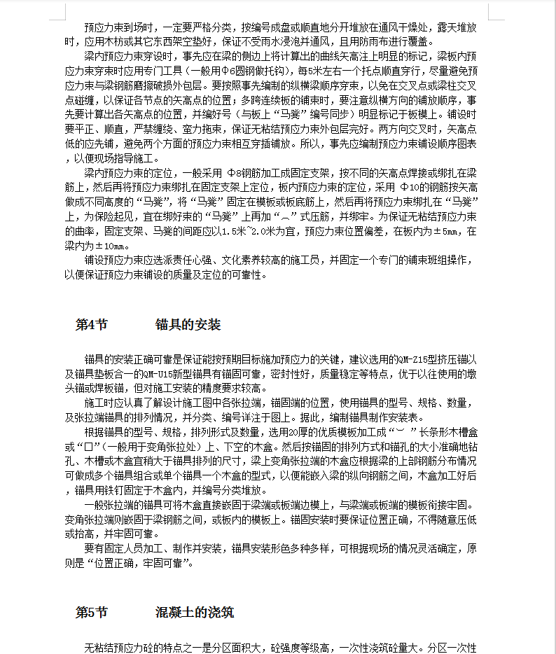 梁内预应力束的定位,一般采用 Ф8钢筋加工成固定支架,按不同的矢高点焊接或绑扎在梁筋上,然后再将预应力束绑扎在固定支架上定位,板内预应力束的定位,采用 Ф10的钢筋按矢高做成不同高度的“马凳”,将“马凳”固定在模板或板底筋上,然后再将预应力束绑扎在“马凳”上,为保险起见,宜在绑好束的“马凳”上再加“︹”式压筋,并绑牢。为保证无粘结预应力束的曲率,固定支架、马凳的间距应以1.5米~2.0米为宜,预应力束位置偏差,在板内为±5mm,在梁内为±10mm。