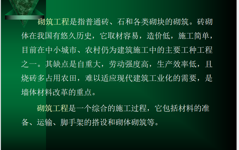 砌筑工程是指普通砖、石和各类砌块的砌筑。砖砌体在我国有悠久历史,它取材容易,造价低,施工简单,目前在中小城市、农村仍为建筑施工中的主要工种工程之一。其缺点是自重大,劳动强度高,生产效率低,且烧砖多占用农田,难以适应现代建筑工业化的需要,是墙体材料改革的重点。