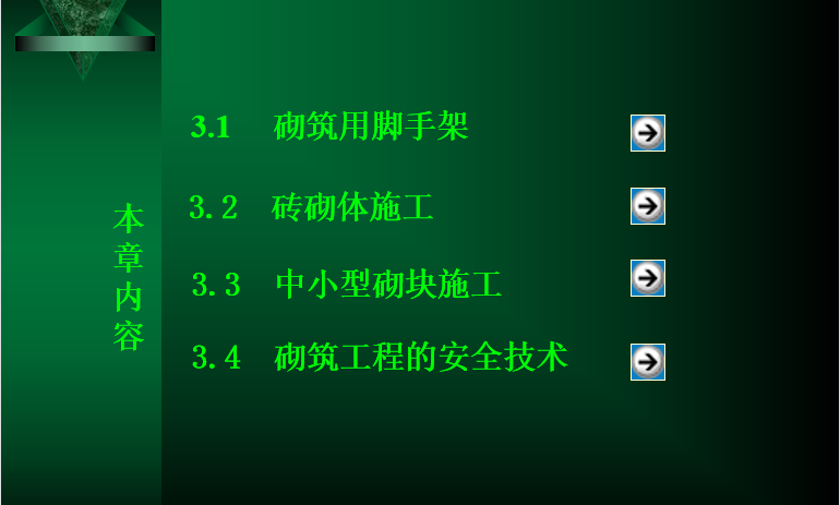 砖砌体的施工工艺、质量要求主要说明:砌筑用脚手架,砖砌体施工,中小型砌块施工,砌筑工程的安全技术