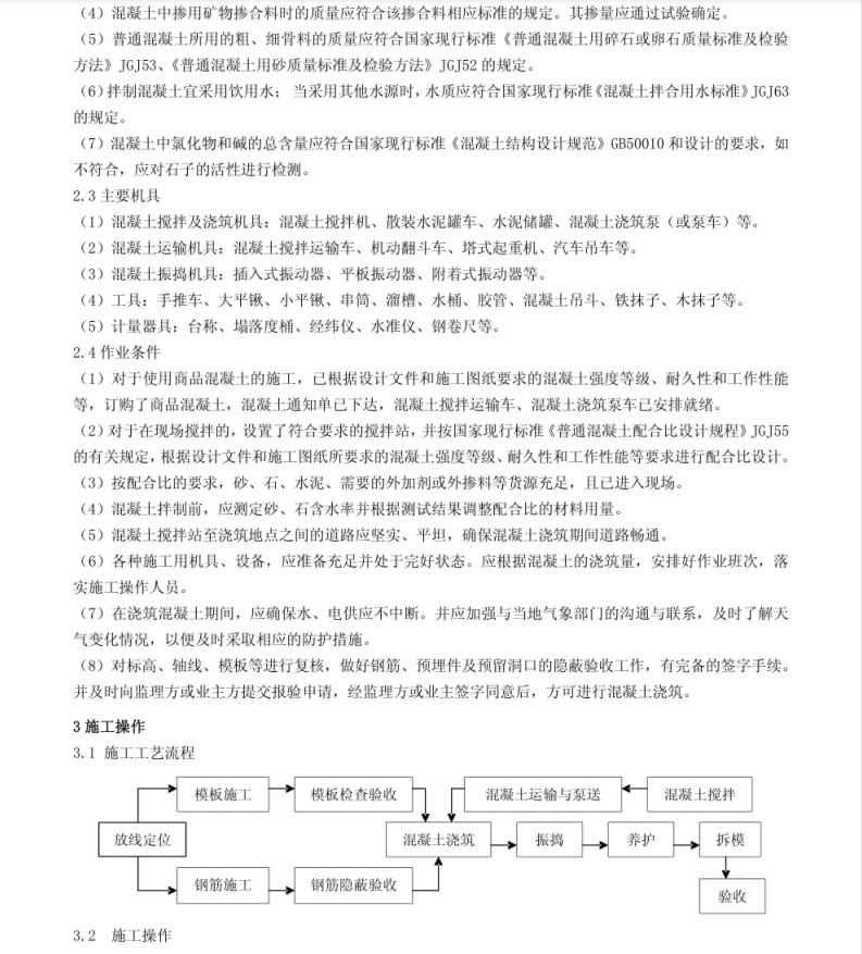 本作业指导书适用于一般工业与民用建筑现浇普通混凝土结构工程的施工,不适用于特种混凝土结构,比如:大体积混凝土、预应力混凝土、高强度或高性能混凝土等其他特殊的混凝土的施工。