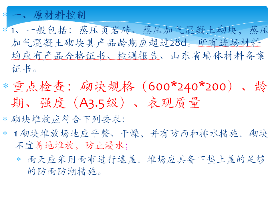 主要内容:原材料控制、施工工艺、质量验收、质量控制措施、成品保护、安全文明施工、施工中常见问题
