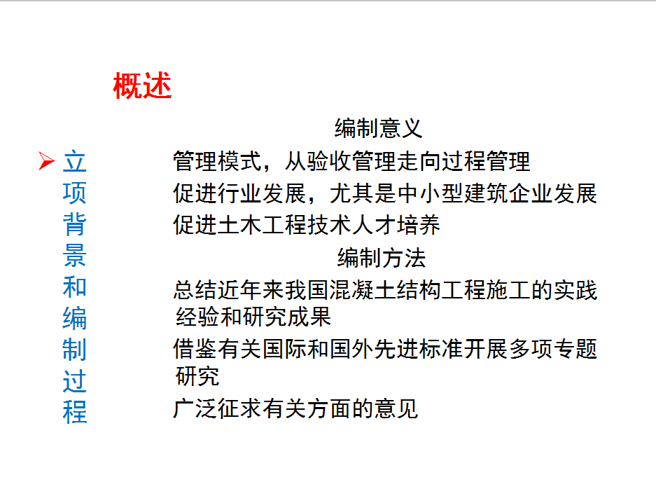 主要内容:总则、术语(新增)、基本规定(新增)、模板工程(变化)、钢筋工程、预应力工程、混凝土制备与运输(变化)、现浇结构工程(变化)、装配式结构工程、冬期、高温和雨期施工(变化)、环境保护(新增)。