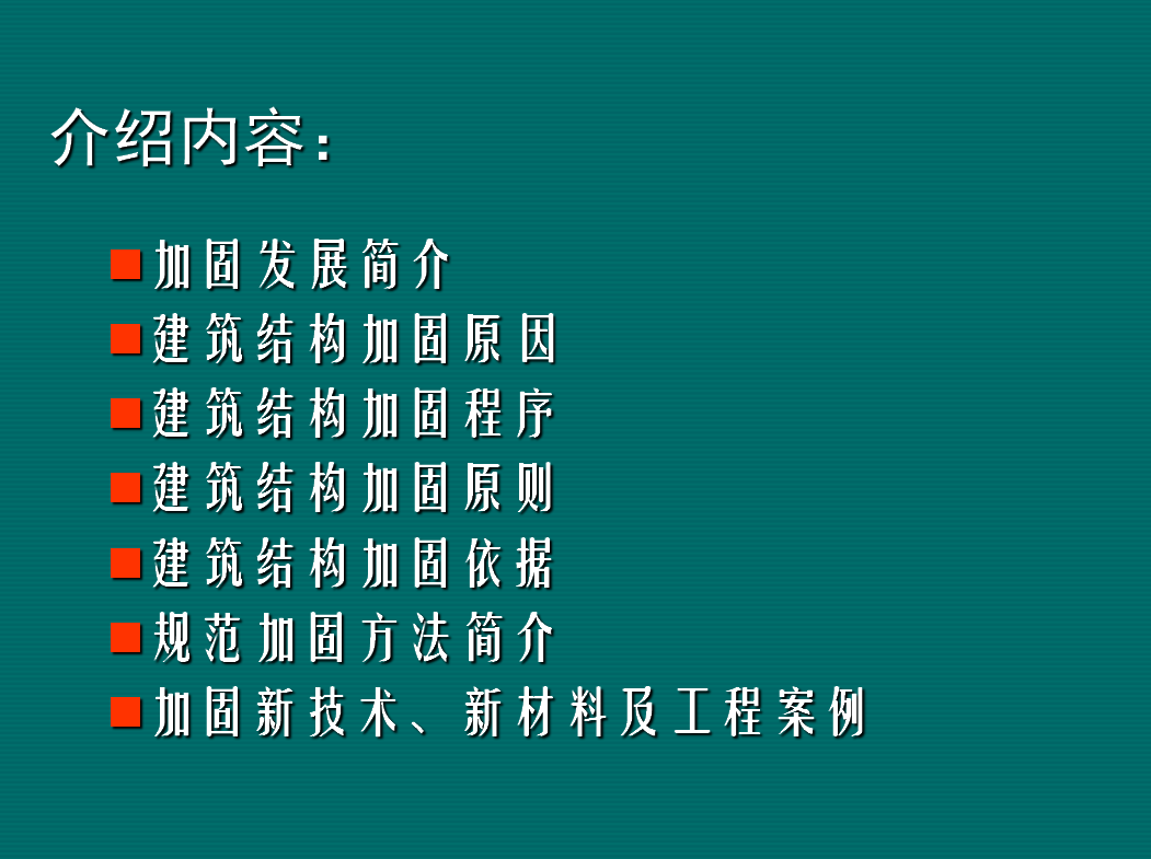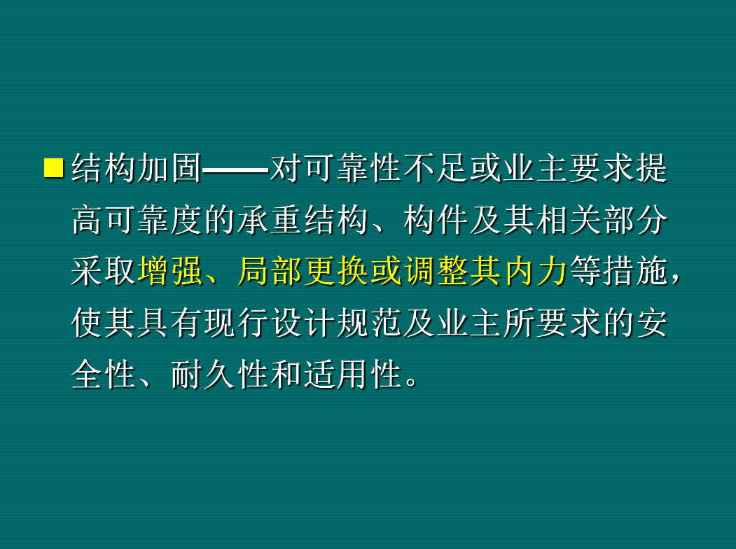 结构加固——对可靠性不足或业主要求提高可靠度的承重结构、构件及其相关部分采取增强、局部更换或调整其内力等措施,使其具有现行设计规范及业主所要求的安全性、耐久性和适用性。