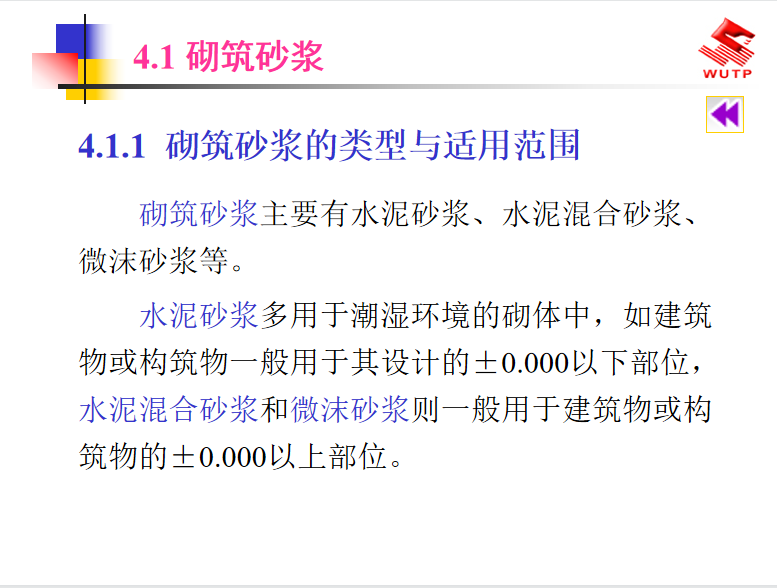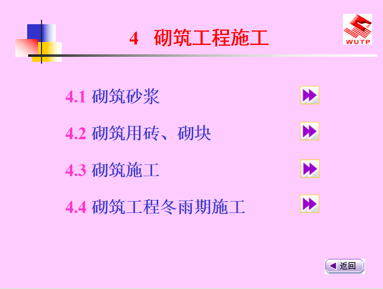 砌筑工程雨期施工要点的主要内容:砌筑砂浆、砌筑用砖、砌块、砌筑施工、砌筑工程冬雨期施工。