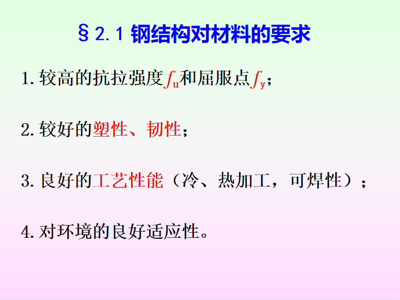 钢结构的连接-钢结构的材料的大纲要求:了解钢结构的两种破坏形式; 掌握结构用钢材的主要性能及其机械性能指标;掌握影响钢材性能的主要因素特别是导致钢材变脆的主要因素;了解结构用钢材的种类、牌号、规格;了解钢材选择的依据,做到正确选择钢材;掌握钢材疲劳的概念和疲劳计算方法。