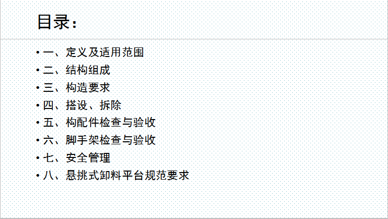 悬挑式钢管脚手架相关规范培训主要内容包括定义及适用范围、结构组成、构造要求、搭设、拆除、构配件检查与验收、脚手架检查与验收、安全管理、悬挑式卸料平台规范要求