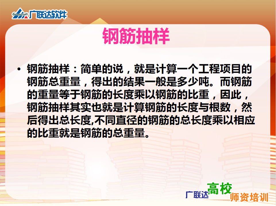 钢筋抽样:简单的说,就是计算一个工程项目的钢筋总重量,得出的结果一般是多少吨。而钢筋的重量等于钢筋的长度乘以钢筋的比重,因此,钢筋抽样其实也就是计算钢筋的长度与根数,然后得出总长度,不同直径的钢筋的总长度乘以相应的比重就是钢筋的总重量。
