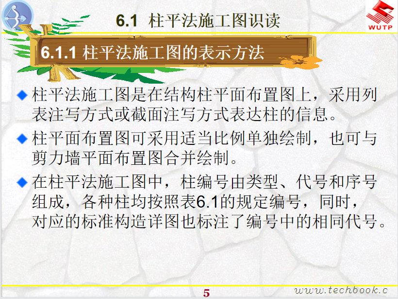 柱平法施工图是在结构柱平面布置图上,采用列表注写方式或截面注写方式表达柱的信息。柱平面布置图可采用适当比例单独绘制,也可与剪力墙平面布置图合并绘制。在柱平法施工图中,柱编号由类型、代号和序号组成,各种柱均按照表6.1的规定编号,同时,对应的标准构造详图也标注了编号中的相同代号。