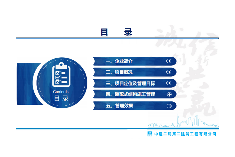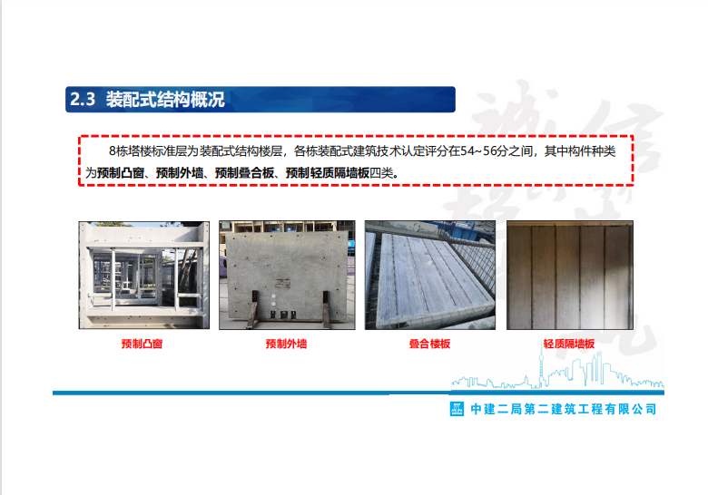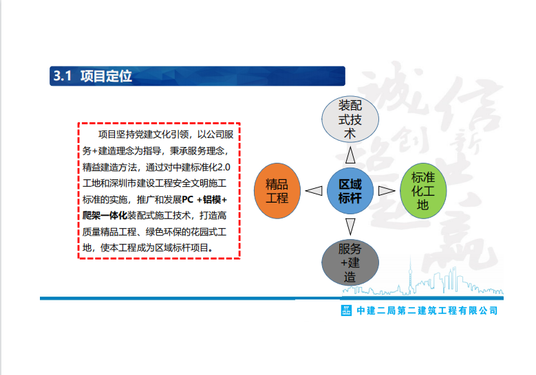 项目坚持党建文化引领,以公司服务+建造理念为指导,秉承服务理念,精益建造方法,通过对中建标准化2.0工地和XX市建设工程安全文明施工标准的实施,推广和发展PC +铝模+爬架一体化装配式施工技术,打造高质量精品工程、绿色环保的花园式工地,使本工程成为区域标杆项目。