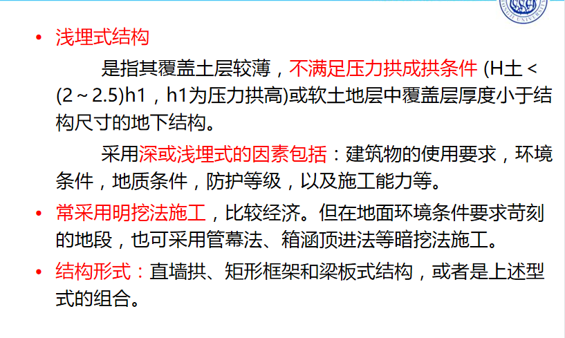 浅埋式结构是指其覆盖土层较薄,不满足压力拱成拱条件 (H土<(2~2.5)h1,h1为压力拱高)或软土地层中覆盖层厚度小于结构尺寸的地下结构。采用深或浅埋式的因素包括:建筑物的使用要求,环境条件,地质条件,防护等级,以及施工能力等。常采用明挖法施工,比较经济。但在地面环境条件要求苛刻的地段,也可采用管幕法、箱涵顶进法等暗挖法施工。