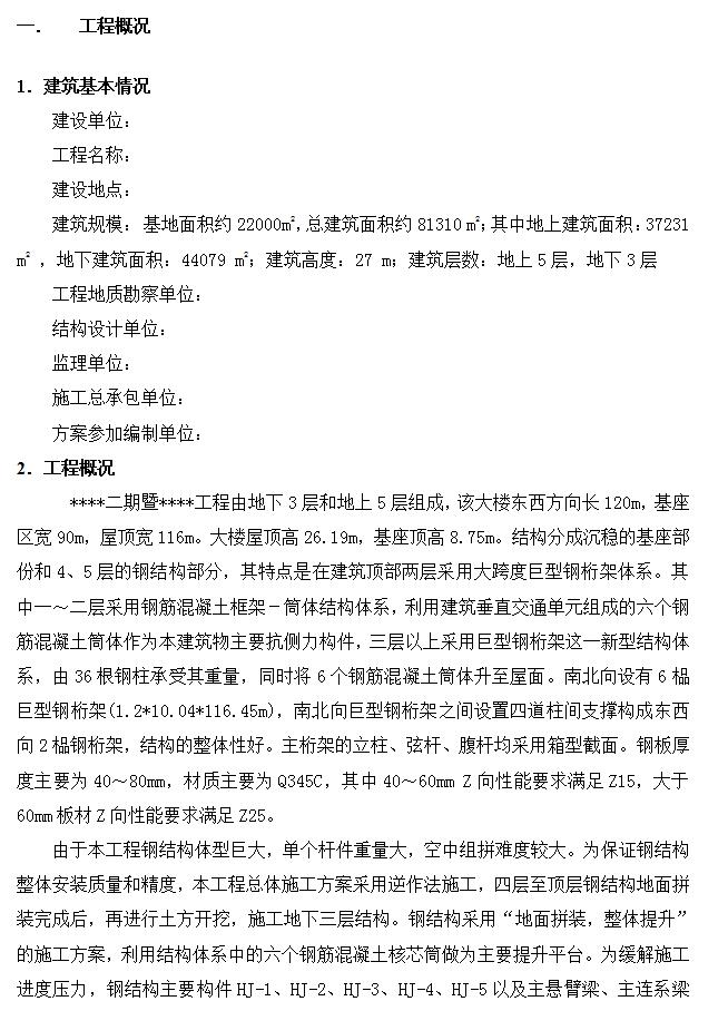 工程由地下3层和地上5层组成,该大楼东西方向长120m,基座区宽90m,屋顶宽116m。大楼屋顶高26.19m,基座顶高8.75m。结构分成沉稳的基座部份和4、5层的钢结构部分,其特点是在建筑顶部两层采用大跨度巨型钢桁架体系。其中一~二层采用钢筋混凝土框架-筒体结构体系,利用建筑垂直交通单元组成的六个钢筋混凝土筒体作为本建筑物主要抗侧力构件,三层以上采用巨型钢桁架这一新型结构体系,由36根钢柱承受其重量,同时将6个钢筋混凝土筒体升至屋面。南北向设有6榀巨型钢桁架(1.2*10.04*116.45m),南北向巨型钢桁架之间设置四道柱间支撑构成东西向2榀钢桁架,结构的整体性好。主桁架的立柱、弦杆、腹杆均采用箱型截面。钢板厚度主要为40~80mm,材质主要为Q345C,其中40~60mm Z向性能要求满足Z15,大于60mm板材Z向性能要求满足Z25。