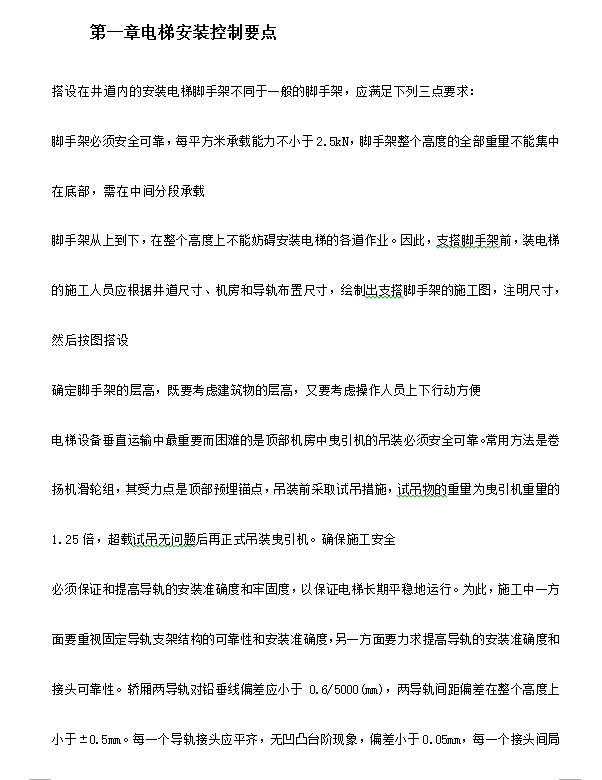 脚手架必须安全可靠,每平方米承载能力不小于2.5kN,脚手架整个高度的全部重量不能集中在底部,需在中间分段承载脚手架从上到下,在整个高度上不能妨碍安装电梯的各道作业。因此,支搭脚手架前,装电梯的施工人员应根据井道尺寸、机房和导轨布置尺寸,绘制出支搭脚手架的施工图,注明尺寸,然后按图搭设确定脚手架的层高,既要考虑建筑物的层高,又要考虑操作人员上下行动方便电梯设备垂直运输中最重要而困难的是顶部机房中曳引机的吊装必须安全可靠。常用方法是卷扬机滑轮组,其受力点是顶部预埋锚点,吊装前采取试吊措施,试吊物的重量为曳引机重量的1.25倍,超载试吊无问题后再正式吊装曳引机。确保施工安全必须保证和提高导轨的安装准确度和牢固度,以保证电梯长期平稳地运行。为此,施工中一方面要重视固定导轨支架结构的可靠性和安装准确度,另一方面要力求提高导轨的安装准确度和接头可靠性。轿厢两导轨对铅垂线偏差应小于0.6/5000(mm),两导轨间距偏差在整个高度上小于±0.5mm。每一个导轨接头应平齐,无凹凸台阶现象,偏差小于0.05mm,每一个接头间局部缝隙小于0.5mm。导轨安装结束后,必须检查验收,符合要求后方可组装轿厢。以后在电梯试运转结束后,应再检查、复测导轨的上述准确度,如有变化,应调整到上述精度范围内,并不发生变化电梯试运转严格按规范分三步进行,第一步是电梯空负荷试运转,第二步是静载试验,第三步是动负荷试运转。每台电梯三步试验都符合要求方可交工验收。静载试验实际上是一种超载试验,电梯处于底层不动,分步往轿厢内加载至150%~200%的电梯额定负载,持续2h以检验电梯各部结构强度和钢丝绳接头强度,保证电梯使用安全,该项试验必须进行不得省略
